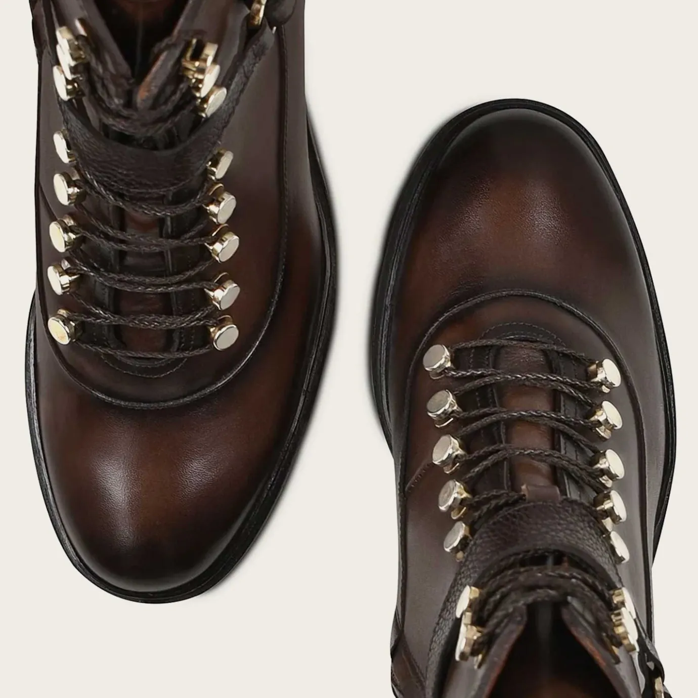 - Designed For Both Comfort And Functionality, These Leather Booties Feature An Internal Closure And Laces Secured With Metallic Applications.